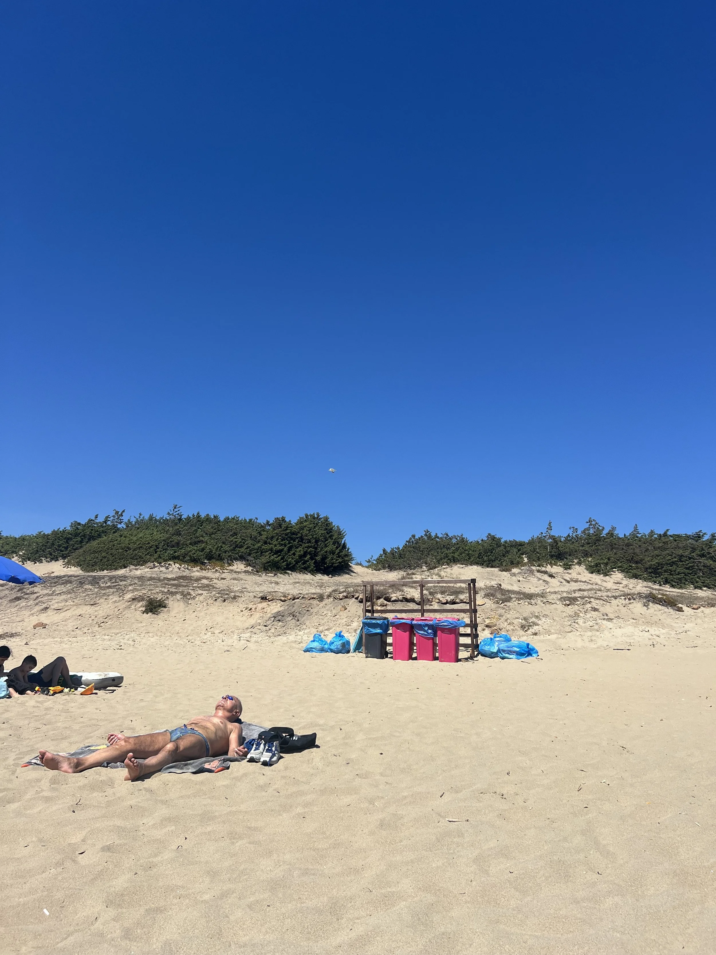 I spread out a towel near the foot of a dune, where a cluster of sea oats and beach grass provide a little natural privacy. The sun is strong, but that ever-present breeze keeps us cool, and occasionally a passing cloud gives a few moments’ relief. Behind us, the dunes and brush serve as a backdrop of nature. I spot a bright green lizard scuttling into a tuft of grass, too quick to photograph. Above, a few gulls wheel lazily, and I fancy I see a larger bird of prey gliding near the cliffs of Monte Circeo, maybe a peregrine falcon, known to nest in these parts.